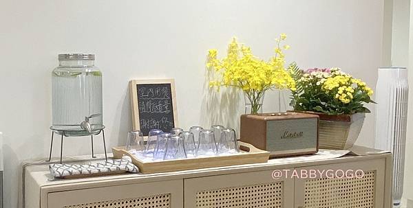 點完餐後,因為舒芙蕾是現點現做需要等候30分鐘左右,因為沒有收取服務費,所以採半自助式,小櫃上的檸檬水可以自由取用~